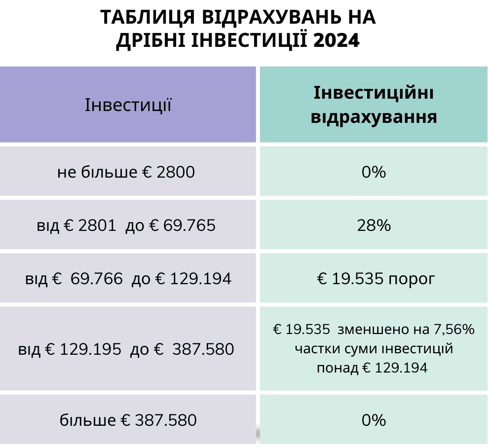 Відрахування малих інвестицій (KIA) — це відрахування, яке означає, що ви платите менше прибуткового податку завдяти цій знижці. Ви маєте на нього право, якщо ви інвестували понад 2800 євро без врахування ПДВ протягом фінансового року. Iнвестиції мають становити понад 450 євро без урахування ПДВ за одиницю.